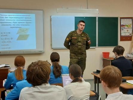 10 ноября, в рамках профориентации, состоялась встреча обучающихся 10 и 11 классов со студентом 3-го курса учебного военного центра имени героя Советского Союза полковника В.Ф. Шишкова Пензенского государственного университета - Егором Чугуновым. Егор познакомил ребят с основной задачей ВУЦ ,это: освоение программ военной подготовки офицеров для прохождения военной службы по контракту. Егор уверен, что защита своей Родины-долг каждого человека! Сказал и о том, что обучение предполагает и получение гражданской инженерной профессии, востребованной в мирное время. Также ознакомил с перечнем экзаменов, необходимых для поступления . В конце встречи Егор ответил на вопросы ребят.